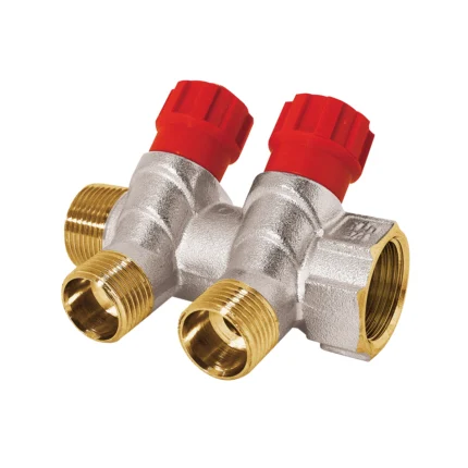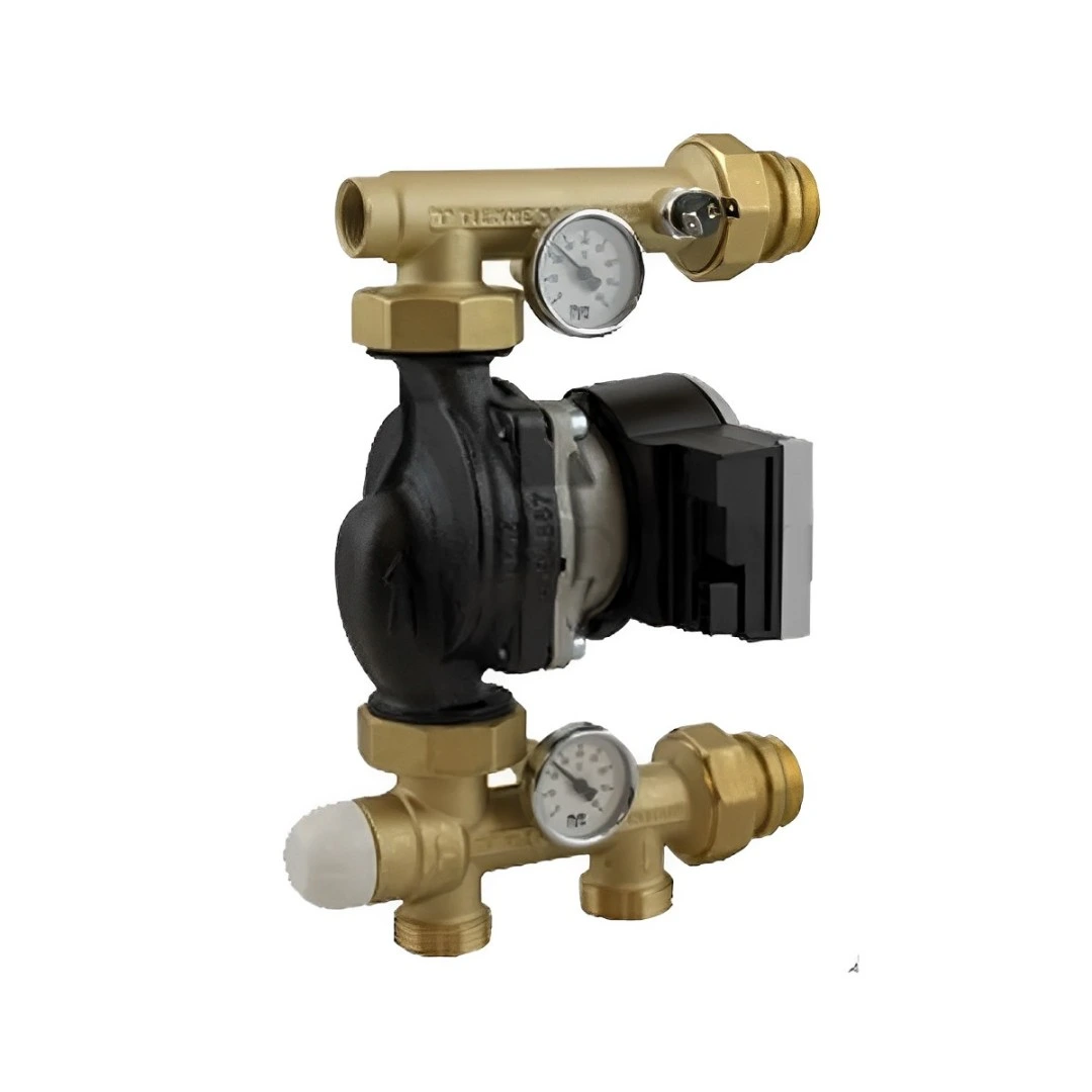 Используется в лучистых системах, когда теплогенератором является высокотемпературный носитель. Смешивает высокотемпературную воду с низкотемпературной водой, подаваемой системой отопления. Смеситель оснащен запорной арматурой и фитингами для комплекта высокотемпературных линейных коллекторов.